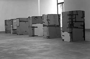 WORKERS WHO CANNOT BE PAID, REMUNERATED TO REMAIN INSIDE CARDBOARD BOXES. Kunst Werke, Berlin, Deutschland, September 2000