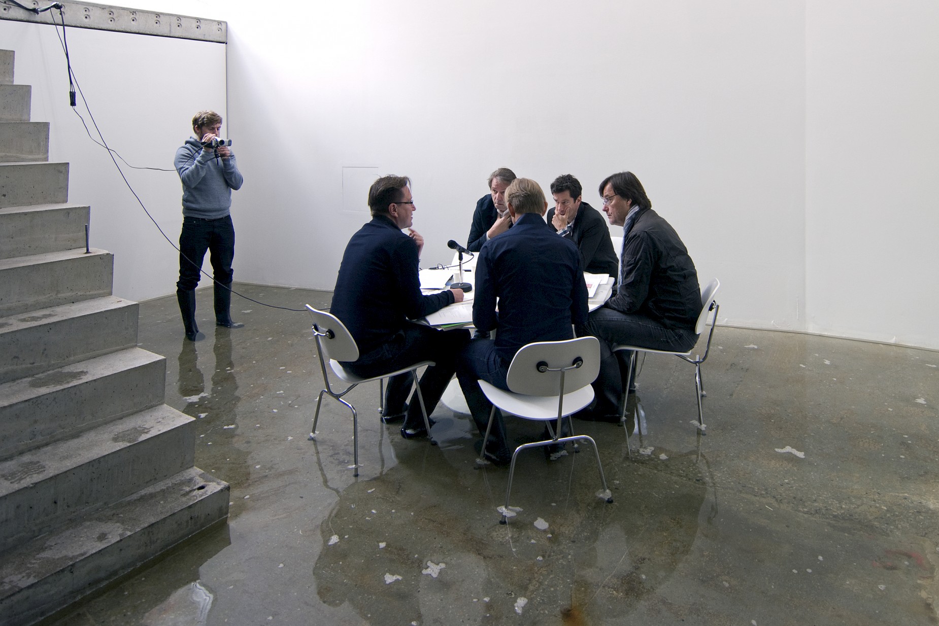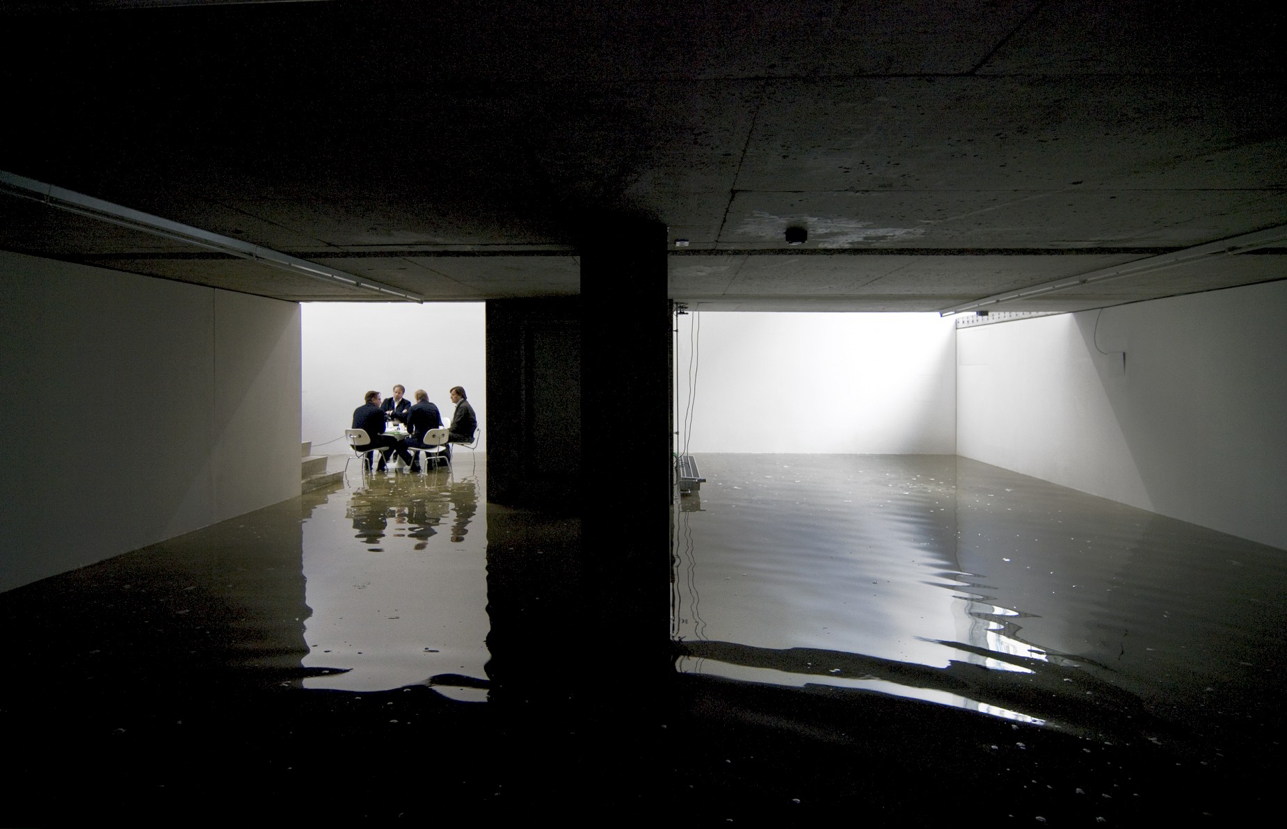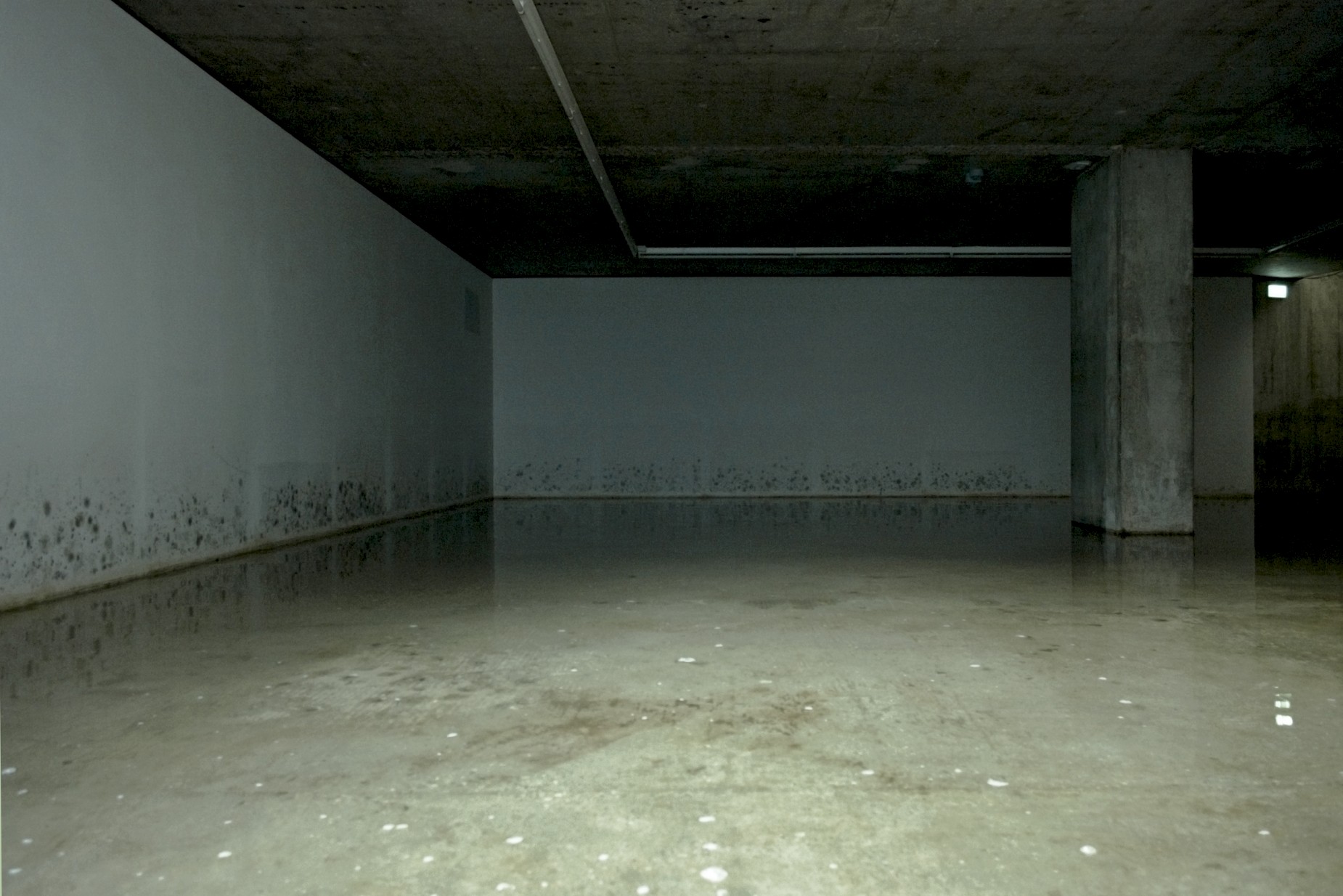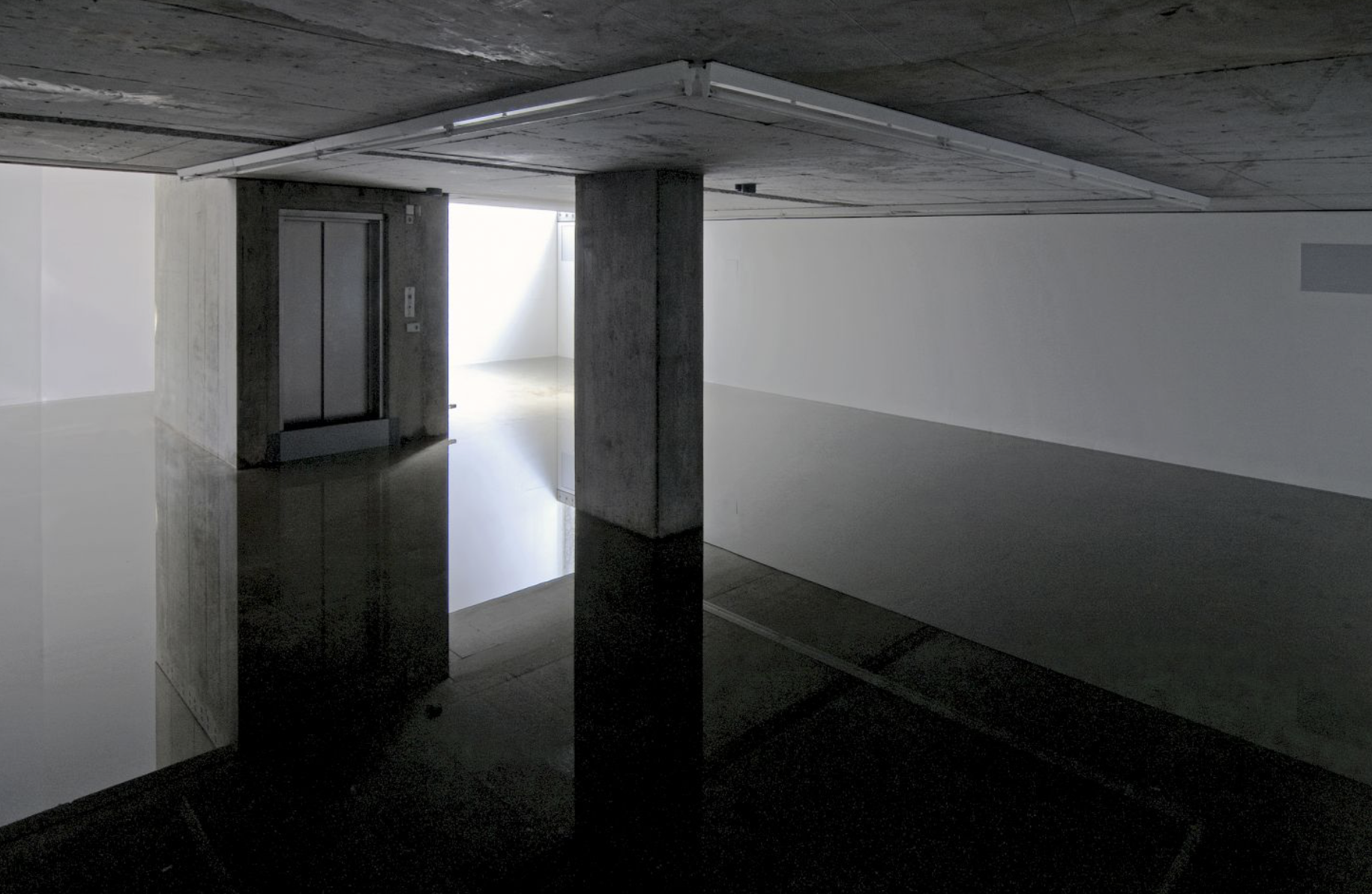 Bei KOW rückt der Architekt sein eigenes Stadthaus Brunnenstrasse 9 in den Kontext dieser Problematik. Entworfen als kostengünstiges Gebäude- und Galeriemodell für heterogene Nutzungsinteressen, ist es doch selbst eine jener Mitte-Inseln, die soziale Homogenisierung verstärken. Alle Nutzer des Hauses (KOW, Redaktion 032c, Brandlhubers Architekturbüro und ein Künstleratelier) sind Akteure des kulturindustriellen Archipels, die ihresgleichen anziehen. Dass sie dies kritisch sehen mögen, ändert daran nichts. Drei Jahre nach Eröffnung der Galerie überprüft Brandlhuber nun das gemeinsame Architekturprojekt – einschließlich der Nutzungspraxis von KOW – auf Zugänglichkeit und Kritikfähigkeit. Türen und Tore der Galerie sperrt er demonstrativ auf, blockiert aber das Kellergeschoss, indem er es flutet – eine Rückschau auf den Ausgangszustand der einst feuchten Bauruine, auf der sein Neubau entstand. Das Wasser unterbricht Zugang und Nutzung des Galerieraums, verstärkt als Spiegelfläche indes den optischen Raumeffekt.