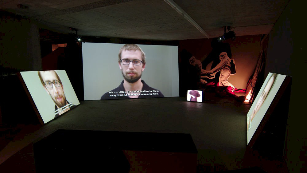 Halb scheint sich das russische Kollektiv von KuÌnstlern, Intellektuellen und Aktivisten noch einmal der eigenen Sprache zu vergewissern, die es im Laufe der Jahre in zahlreichen Filmen, Performances, Bildern und Objekten, Aktionen und Publikationen entwickelt hat, um den Anspruch eines progressiven Denkens erneut zu reklamieren, das sich eine andere Zukunft vorstellen kann als die, die man uns alternativlos vorauszeichnet. Und halb scheint diese Sprache zu kapitulieren vor der ruinierten Ambition, in Kriegszeiten noch eine öffentliche Stimme zu sein. In unserem Untergeschoss wird die Katastrophe schlieĂlich global. AufgeblĂ€hte Zeitungsbilder verstellen den Galerieraum mit Syrien, Ebola und IS, MilitĂ€rkonvois und fickenden russischen OligarchenbĂ€ren. Mittendrin eine vierteilige Videoinstallation, „The Excluded, in a Moment of Danger“. Absolventen der von Chto Delat in St. Petersburg betriebenen School of Engaged Art und Aktivistenfreunde rekapitulieren ihren eigenen Standort als verwaiste Akteure der Geschichte, die ihre eigene Historie erzĂ€hlen. Sie verhandeln die Ereignisse, verlieren mitten im Diskurs die Bedeutung ihrer Stimme, drehen durch, stehen auf, werden Körper und finden zu sich selbst als eine Gemeinschaft von wach-verwirrten, Ă€ngstlich-aufmerksamen Menschen, die einander brauchen.
