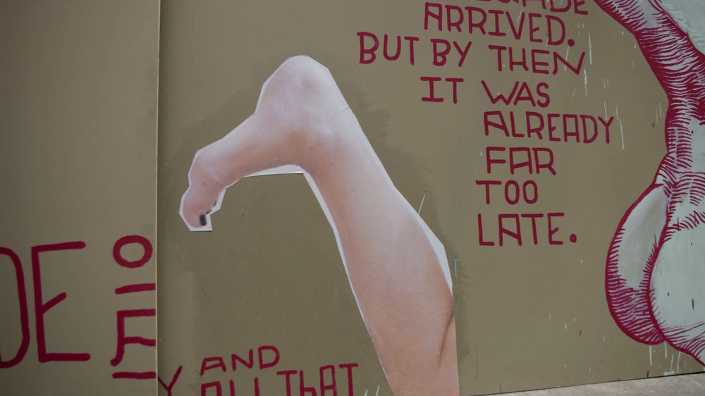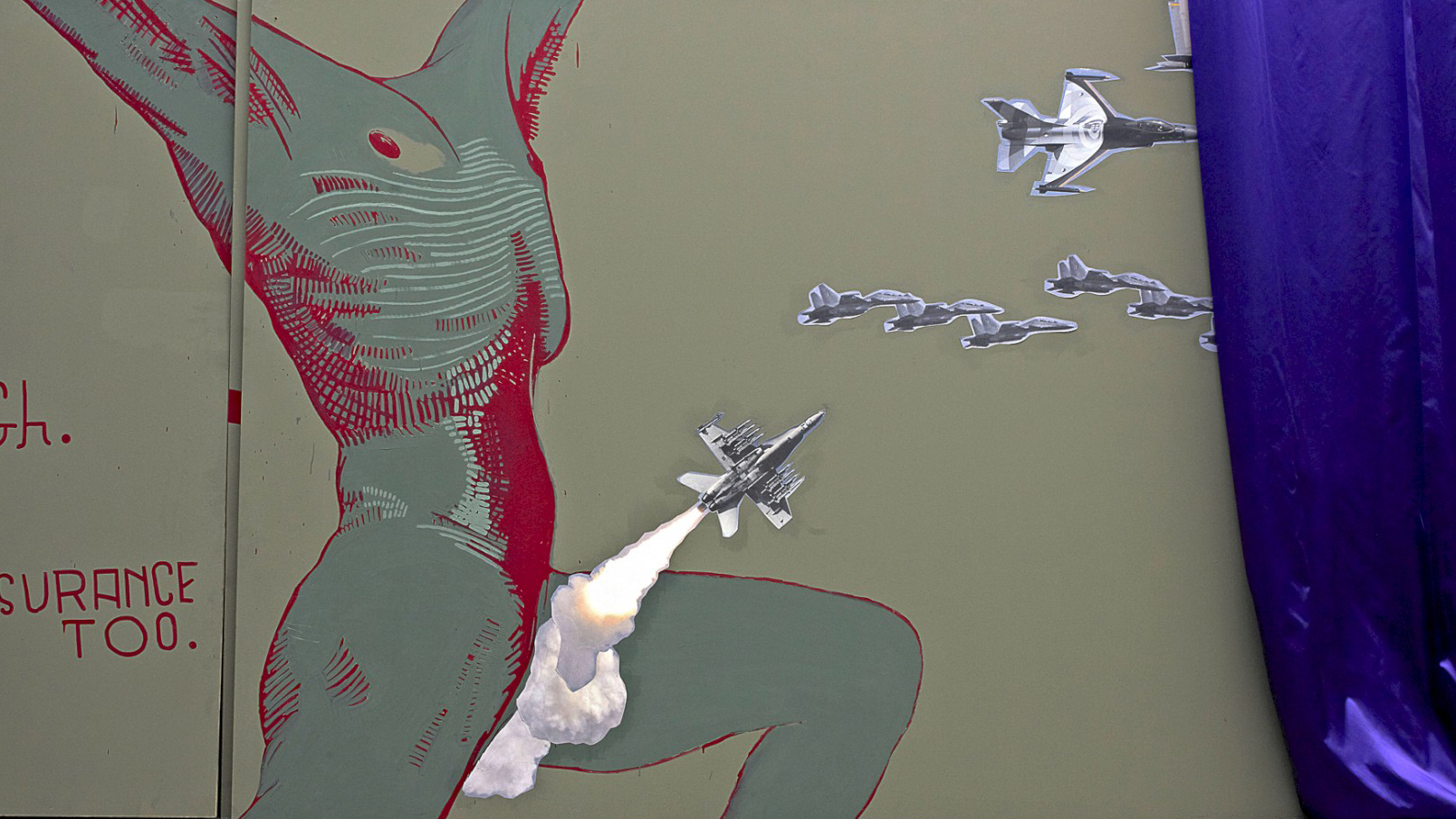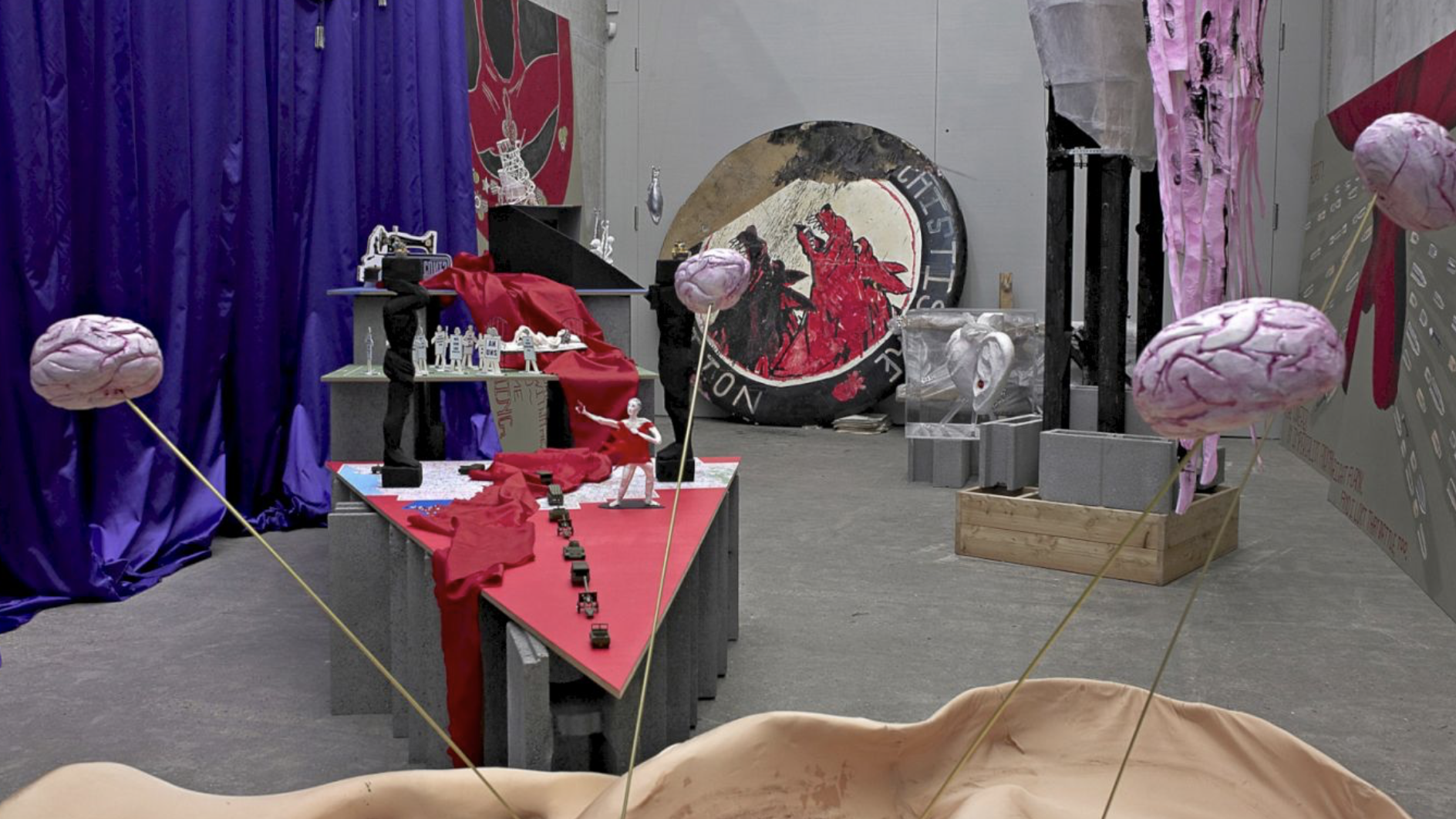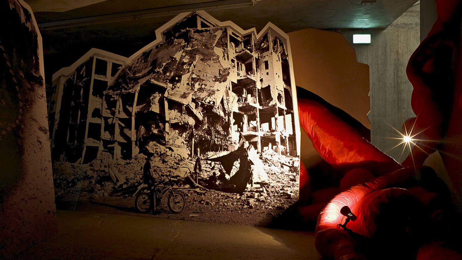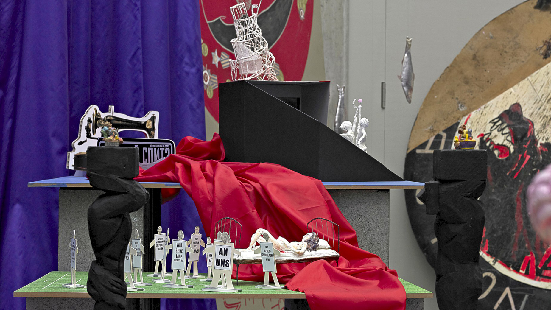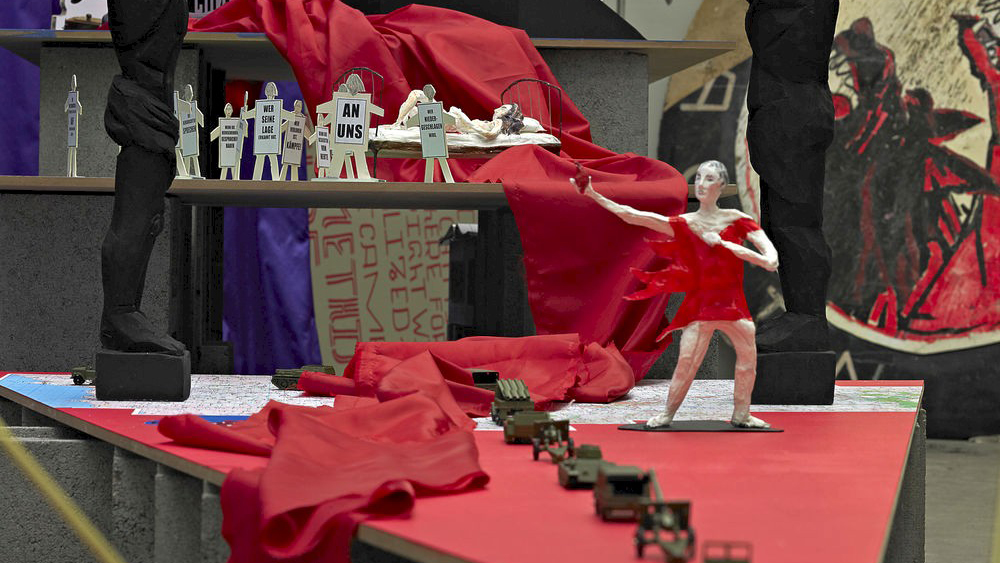 Jemand verbrennt. Von innen. Erst vergehen die Sinne, dann brennt das Herz, zuletzt lodert die Hoffnung. Es ist die SchluÌsselszene dieser Ausstellung: Ein Text uÌber die VerstuÌmmelung eines Ich â seines Körpers, seiner Wahrnehmung, seiner Ideale. Aufgeschrieben von Chto Delat als innere Stimme ihrer antifaschistischen Skulptur âOur Paper Soldier“, die am 24. Juni 2014 einem BRANDANSCHLAG zum Opfer fiel. Das sechs Meter hohe Monument entstand fuÌr die Wiener Festwochen und reiste dann zu den Berliner Festspielen, wo es Unbekannte nachts mit Benzin und Streichholz zerstörten. âIch hĂ€tte nicht gedacht, dass ich vom Argwohn gegen die Macht der Kunst angegriffen wuÌrdeâ, lassen Chto Delat ihre verkohlte Soldatenskulptur sagen, und dann: âNachdem ich mich selbst verloren hatte, nachdem die Katastrophe fuÌr immer in mir war, verstand ich, dass ich etwas anderes wurde.â Was ist dieses Andere? Das ausgebrannte Werk kehrte als untoter Kombattant wieder, als queeres Zombiemonument erstand es im Herbst fuÌr die Wiener Secession wieder auf und kam nun fuÌr unsere Ausstellung erneut nach Berlin. Ohne Kopf, mit aufgerissener Brust und einem herabhĂ€ngenden FluÌgel steht es wie ein versehrter Engel der Geschichte in der Galerie. Ein zerschossener Phönix, der inmitten spielzeughafter Szenerien steht â darunter eine Miniaturkulisse des russischen Einmarschs in die Ukraine â, bildnerischen Fragmenten aus vergangenen Filmproduktionen und persönlichen Erinnerungsfetzen, die Chto Delat zusammengetragen hat und zuletzt um neue StuÌcke ergĂ€nzte.