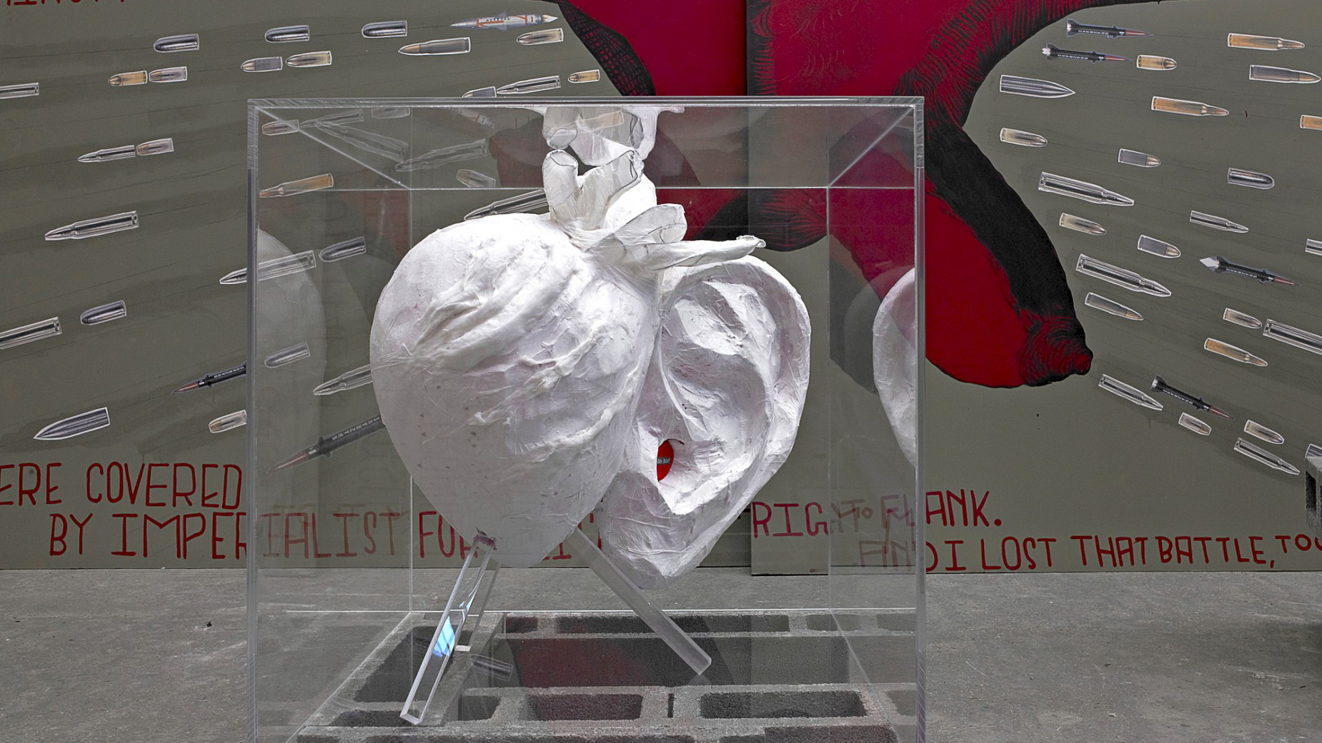 Solange es Hoffnung gibt, wird die revolutionĂ€re Aktion aufgeschobenâ,(2) schreibt Timofeeva und erteilt dem wartenden wie auch dem beschleunigenden Optimismus eine Absage. âVergessen wir also die Hoffnung. Die Revolution beginnt in der Hölleâ. Und die Hölle ist jetzt. In ihr kann man weder leben noch sterben und brennt auf alle Zeit in den Konsequenzen vergangener Taten. In einer paradoxen Wendung ziehen Chto Delat den Schluss, aus dem Lauf der Zeit selbst auszusteigen und suspendieren unter den Augen eines kopflosen Engels der Geschichte ihre Hoffnung auf progressiven Wandel, um einer undenkbaren VerĂ€nderung, einer unbekannten Revolution Platz zu machen, die an irgendeinem Tag kommen mag, an dem dann die Geschichte wieder beginnt. In der Galerie steht eine Vitrine. Darin ruht ein papiernes Herz mit einem angewachsenen Ohr. Innerlichkeit untrennbar von der Wahrnehmung des AuĂen. Es ist eine Zeitkapsel, in der Mitglieder des Kollektivs persönliche Objekte in eine namenlose Zukunft schicken und damit die Möglichkeit eines anderen Lebens vertagen. Das Ohr ist mit einem roten Pfropfen verschlossen, auf dem „Chto Delat?“ steht. Eine selbstgewĂ€hlte Wahrnehmungssperre als Schutz vor dem Krach einer irren Gegenwart?