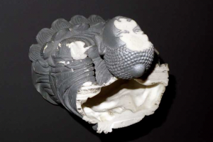 Dave, 2013: Two shells facing one another are resting on the floor. Pinned between them is a dead pigeon, half pulled voraciously inside the shells, half pensively caught in the middle of an existential fight for life, in which the bird extends a wing upward. Present once again is the protective housing that runs throughout Smith’s work. Lying by itself in the expansive spaces of the Ludwig Forum Aachen, the pair of shells forms a small, outwardly protective, closed-off entity by turning their open and vulnerable sides toward one another. Of course, the pair is also just an empty shell, and, when counting the pigeon cadaver, three dead beings are joined together here. Nevertheless, they stand together like a small community in a hostile environment. Dave, the title, refers to Dave Thomas, the popular founder of the Wendy’s hamburger chain, one of the junk food enterprises that does not increase lifespan in the US. Given that the meat patties of hamburgers are pinned between two buns like the pigeon between the shells, the work and the title are rife with synonymous implications.