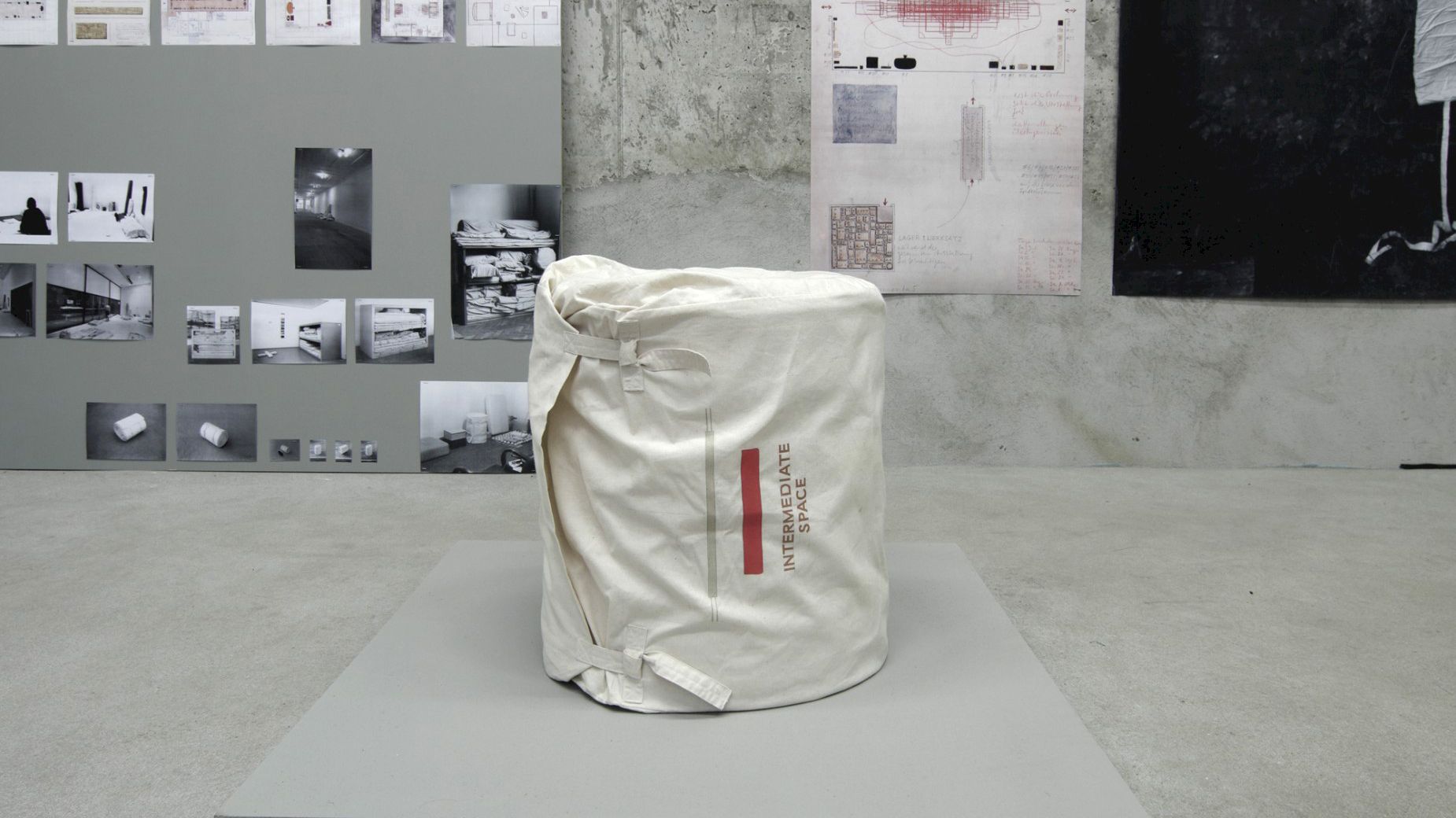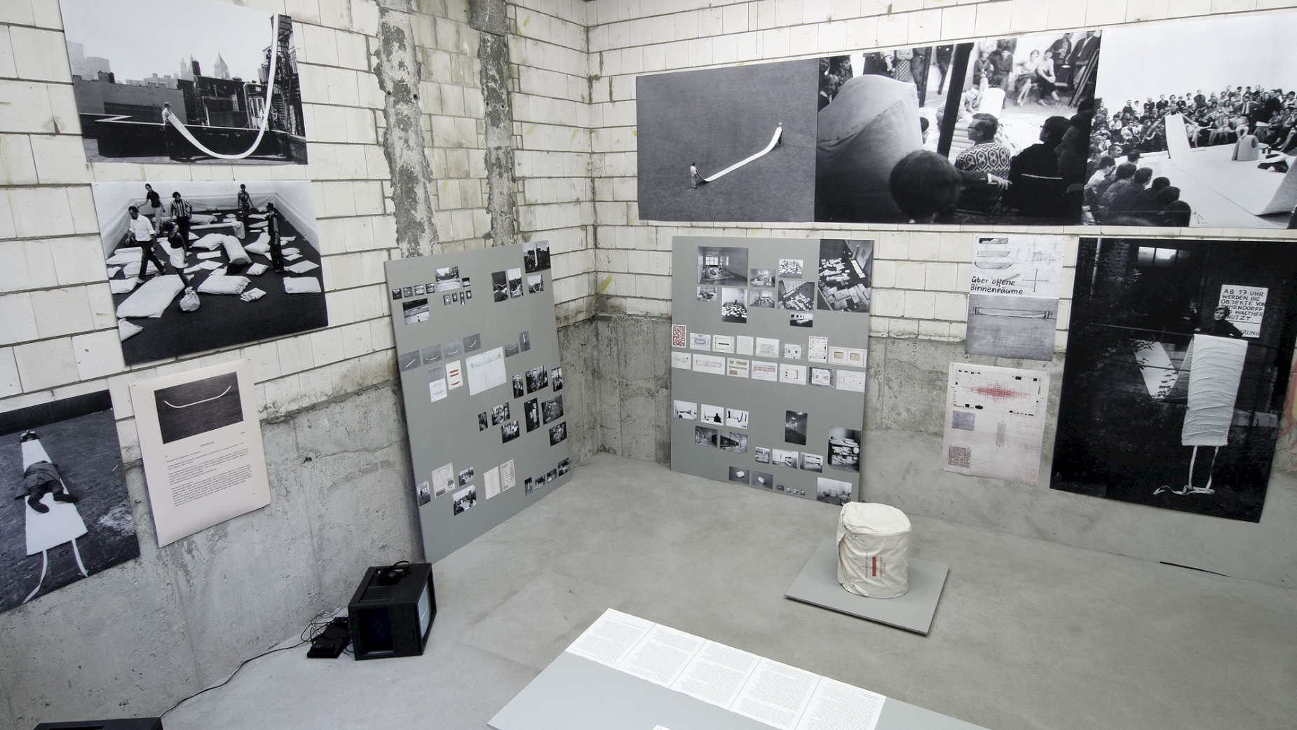 Aber zu welchem Gebrauch taugen nun die Werkstücke des 1. Werksatzes? Zu welchem nicht? Welche Verwendungsformen wären eine Überraschung? Nehmen wir die Elfmeterbahn von 1964. Die weiße, elf Meter lange Textilbahn aus Nylonstoff mit langen Schlaufen an ihren Enden ist in ihrem Lagerzustand aufgerollt. Was mit ihr zu tun ist wissen wir aus einer Werkdemonstration Walthers oder Aufgrund von schriftlichen Handlungsanweisungen, durch erklärende und reflektierende Zeichnungen oder aus inszenierten oder dokumentarischen Fotografien und Filmaufnahmen: Zwei Personen können die elf Meter Textil ausrollen, die Schlaufen um ihren Hals binden und die Bahn zwischen ihre Körper spannen. Ihr Abstand zueinander ist so variabel wie es die Beschaffenheit der Bahn erlaubt. Sie schauen sich dabei vielleicht an und verständigen sich über die Situation. An welchem Ort? In einem Museum? Auf einer leeren Wiese? Im Berliner Hauptbahnhof? Wird gesprochen? Worüber? Wird sich bewegt? Wechseln die Benutzer?