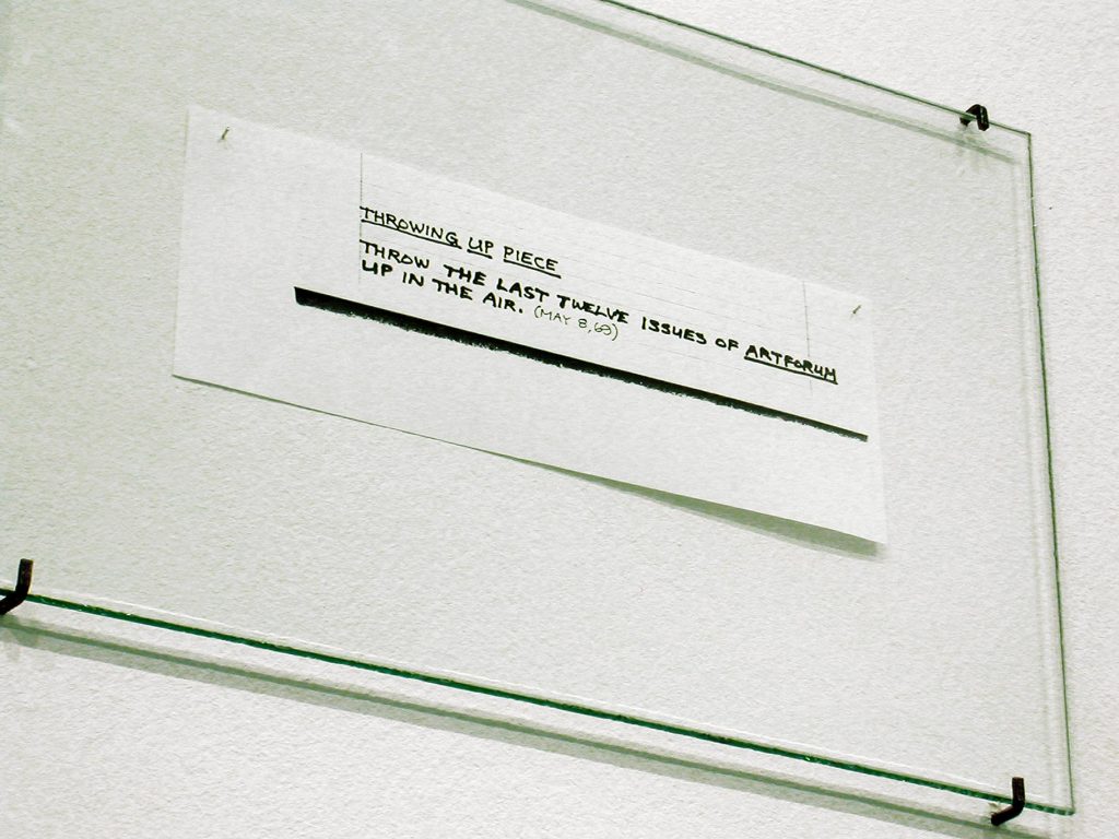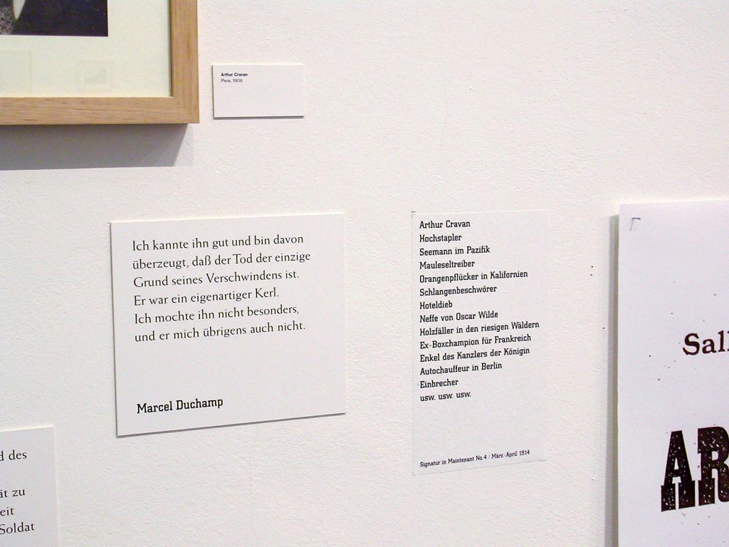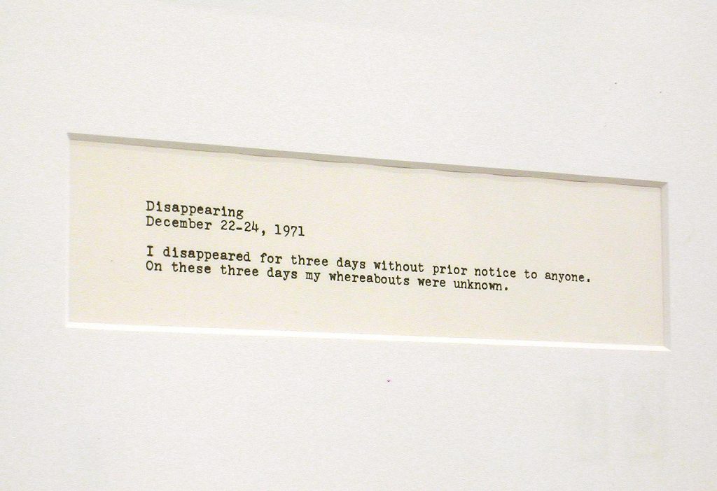 I am grateful for this revival of the original 2002 exhibition because it was an important project to me for reasons both private and methodological. Gestures of Disappearance was a curatorial narrative that operated largely without original works of art. I needed works on loan only for Chris Burden and a few pieces by Ader; much of the rest were photocopies and texts that were presented in typographic designs by the Leipzig-based graphic artist Till Gathmann. I obtained copies of Lee Lozano’s language pieces and notes from the archive maintained by her estate in New York and presented them as they were. In Barcelona I met Isaki Lacuesta, who was working on a documentary film about Arthur Cravan and had compiled valuable material. He gave me a shoebox full of photocopies that I used as sources for reproductions. We then arranged for a pre-premiere of Lacuesta’s film in conjunction with the exhibition in Leipzig. I received permission from Bas Jan Ader’s estate to make my own reproductions of several works and documents, and the exchange of letters with the estate and his widow, Mary Sue Ader, led to the discovery of film footage about Ader’s last project that had never been shown in public.