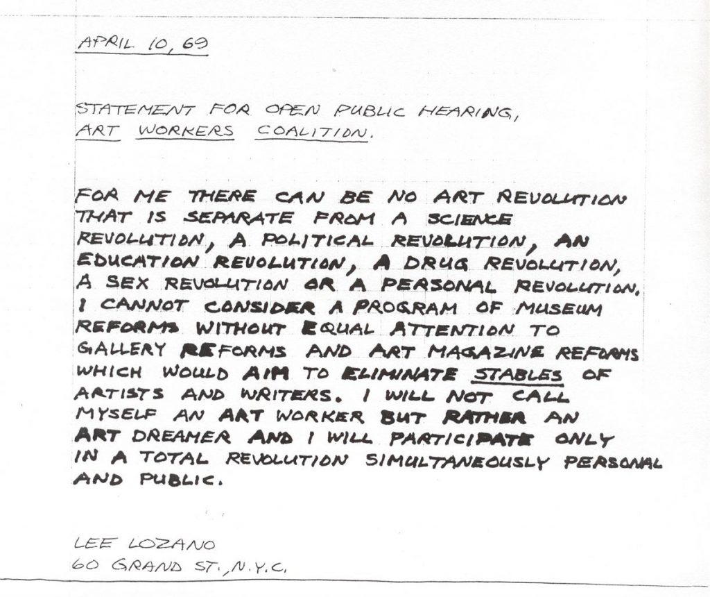 When I started researching the subject, my initial question turned out to be a blank area—indeed, a blind spot—on the maps of theory production and the historiography of art. The deliberate abandonment of an artistic practice, the decision to shed the artist’s role, the withdrawal from the art world: no one, it seemed to me at the time, had seriously looked into or even thought through these things. So Gestures of Disappearance marked the beginning of a project I pursued over the course of several years, trying to close that gap (see General Strike, 2011). I never produced a second exhibition, however, because that would have seemed to me to run counter to the core issue. The act of dropping out of art as such cannot be put on display, and in the exceptional instances where it can—because we can identify works and documents that make the threshold situation of a gradual or sudden renunciation of all involvement in the art field tangible—the point of the whole enterprise would remain questionable. Why should I as a curator try to capitalize on it by putting together a spectacular display of artists’ letters of resignation? I had done something of the sort with Lozano and Cravan, but, although few people knew about them thirteen years ago, the art-historical literature had already taken note of their lives, albeit in incomplete accounts.