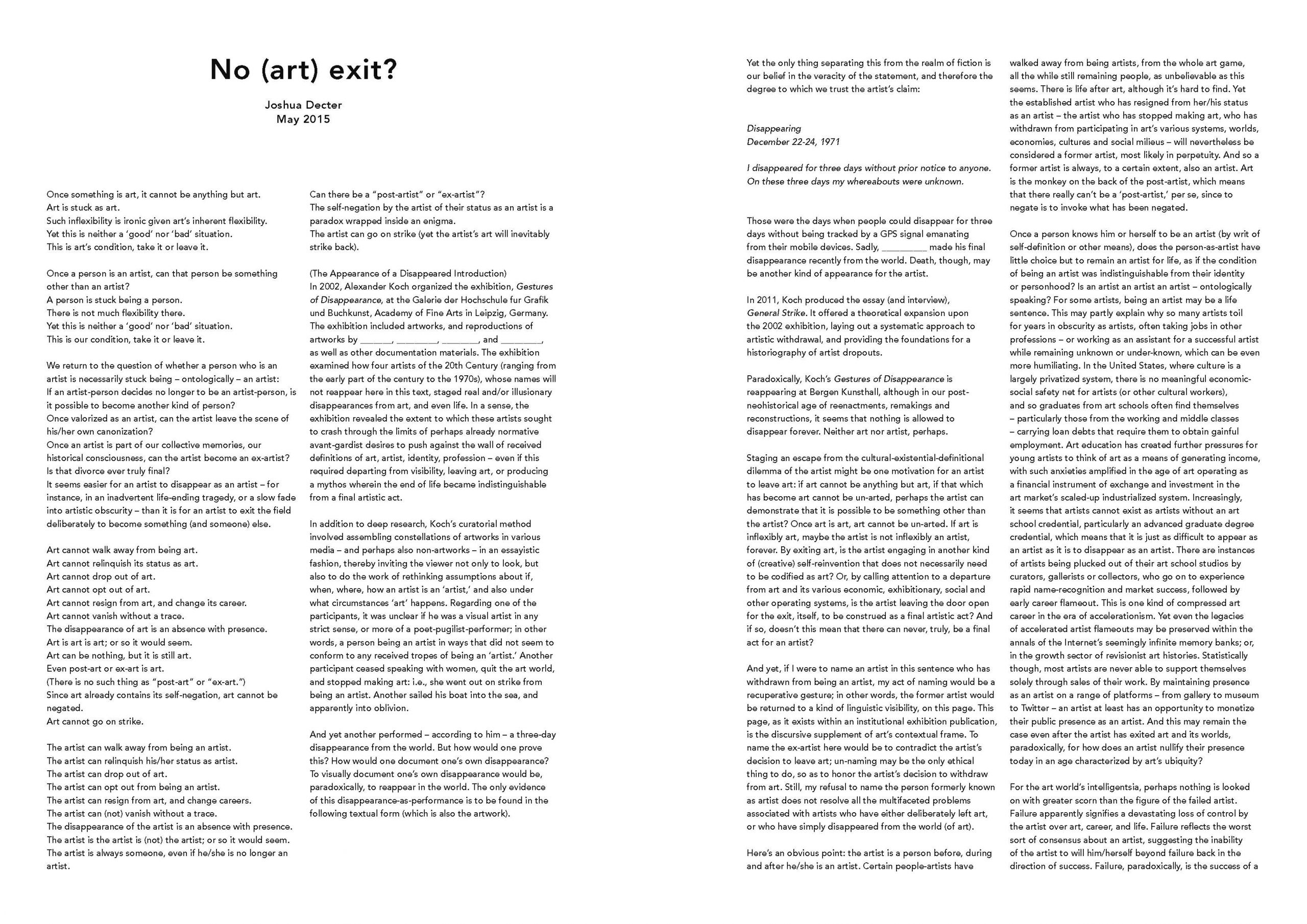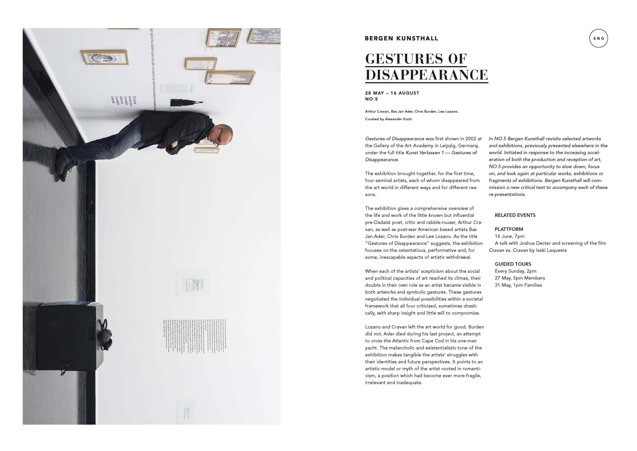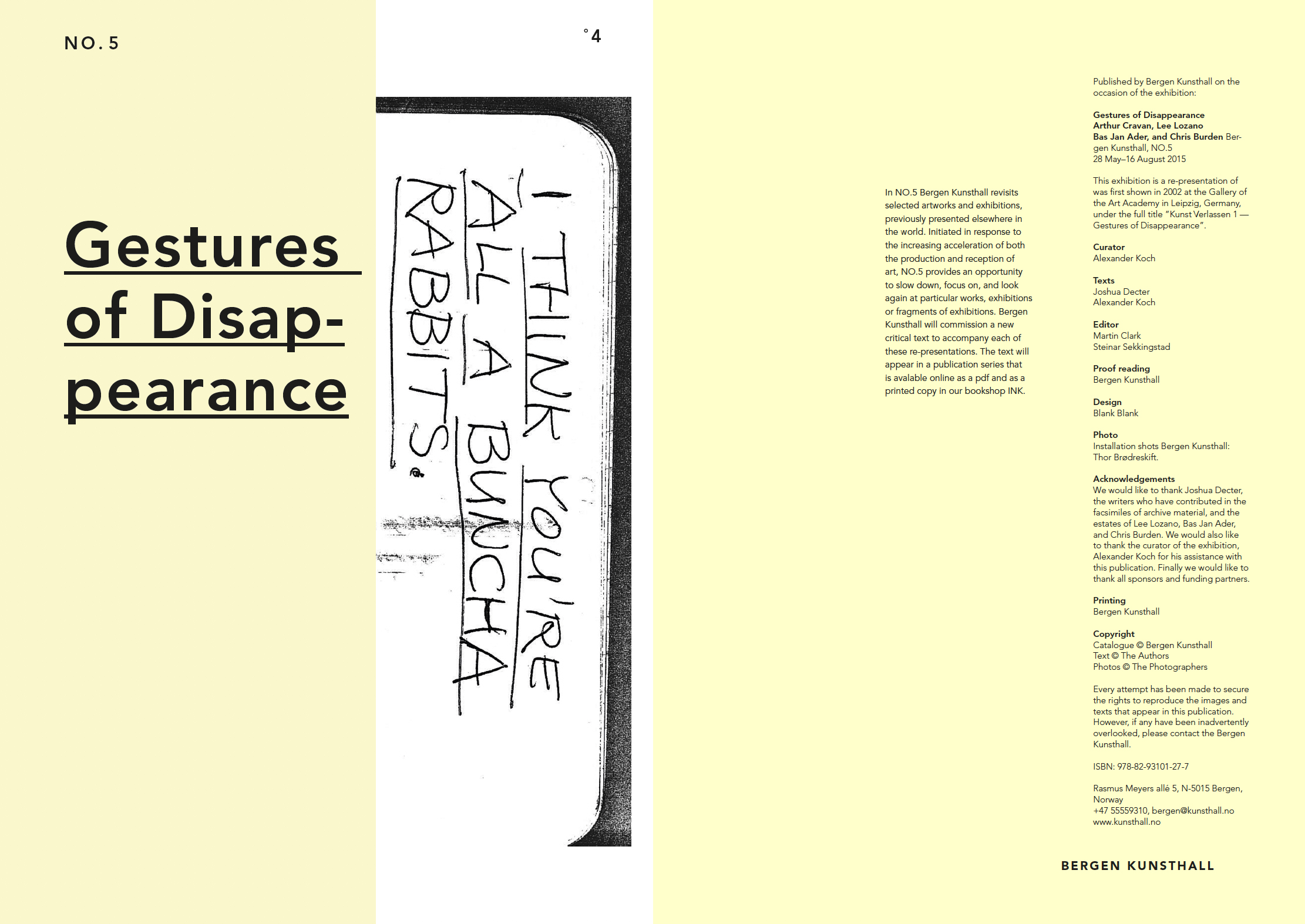 „In NO.5 Bergen Kunsthall revisits selected artworks and exhibitions, previously presented elsewhere in the world. Initiated in response to the increasing acceleration of both the production and reception of art, NO.5 provides an opportunity to slow down, focus on, and look again at particular works, exhibitions or fragments of exhibitions. Bergen Kunsthall will commission a new critical text to accompany each of these re-presentations. The text will appear in a publication series that is available online as a pdf and as a printed copy in our bookshop INK.“Â