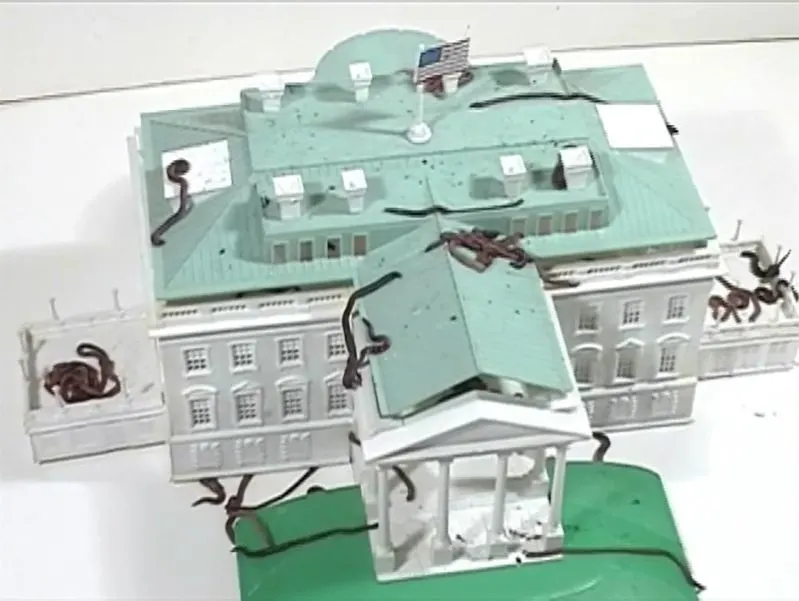 Das Weiße Haus ist bewohnt von Regenwürmern. Sie kriechen durchs Oval Office, in die privaten Gemächer, hängen von dem Fahnenmast auf dem Dach, schmieren ihren Schleim auf die amerikanische Flagge. Das Video Casa Blanca von 2005 ist der Auftakt unserer Ausstellung. Wird hier ein stolzes Symbol geschändet? Eine Ikone beschmiert? Was hatte León Ferrari im Sinn? Blasphemie?
