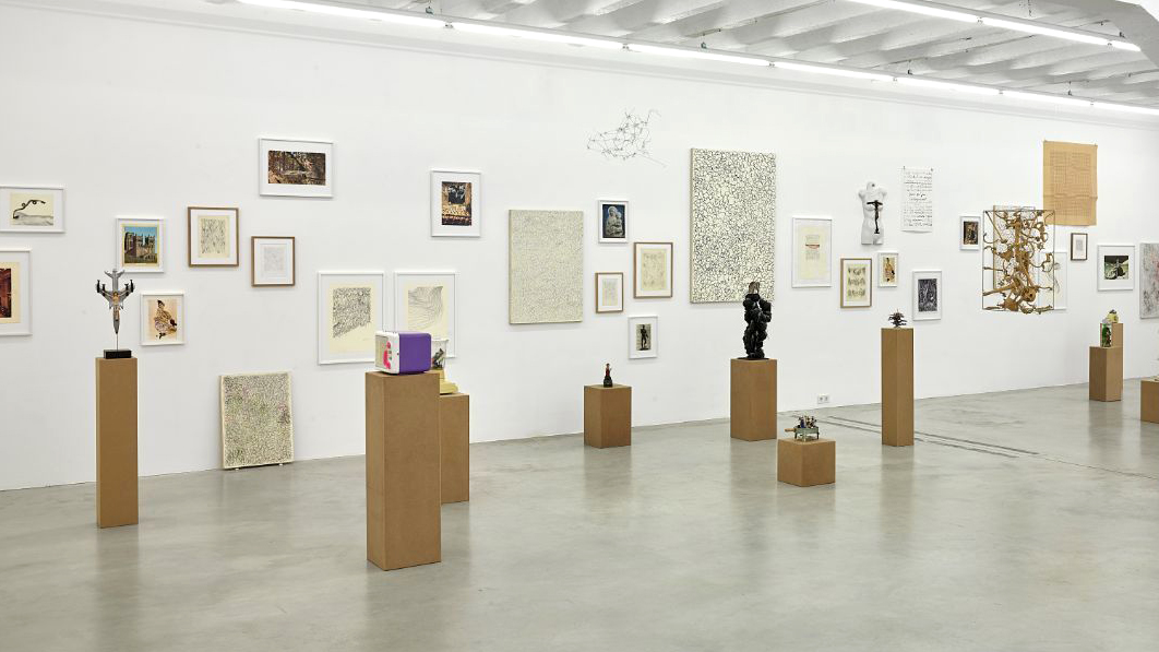 Neben den ikonoklastischen und offensichtlich politischeren Arbeiten stehen in Ferraris Werk Skulpturen, Lithographien, Zeichnungen und Gemälde, die im Laufe mehrerer Jahrzehnte entstanden und eine abstraktere, konzeptuelle Formensprache sprechen. Wir zeigen zwei seiner minimalistischen Stahlplastiken, die er in den späten Siebzigerjahren entwickelte. Dutzende senkrechter Metallstangen lassen sich von Besucher*innen in Bewegung versetzen und zum Klingen bringen. Die Plastik wird zum Musikinstrument, das sich mit mehreren Händen gemeinsam spielen lässt. Frühe Zeichnungen und späte Drucke greifen diese filigranen Bewegungen auf, übersetzen sie in eine Sprache aus Linien und Knotenpunkten, die der Hypertextualität des Internetzeitalter bereits in den frühen Sechzigerjahren vorzugreifen scheinen, aber auch als konkrete Poesie den Raum zwischen Wort, Schrift und Geste vermessen. Bisweilen sind sie anarchischer Ausdruck ohne Wortsinn, dann wieder als Pamphlete lesbar.