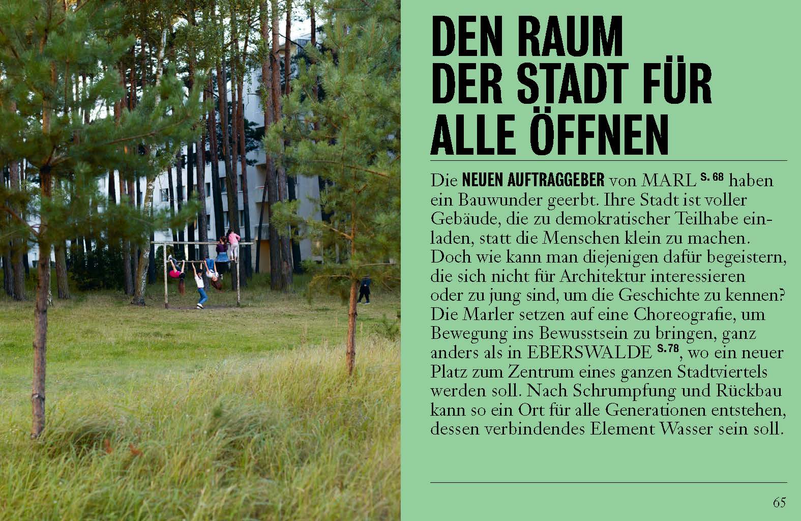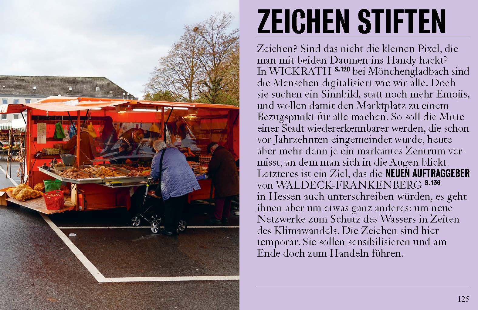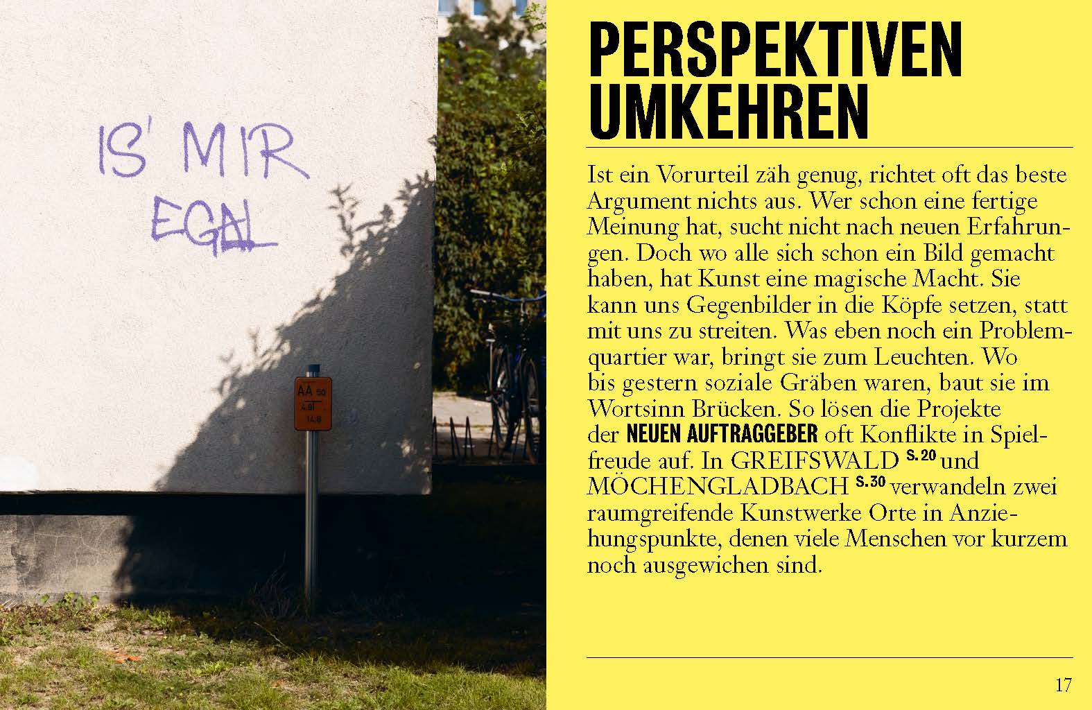 Jeder der 17 Orte wird als eigene Fallstudie erzählt. Die Entstehung der Projekte wird vom ersten Tag bis zum fertigen Entwurf nachvollziehbar. Damit wird das Buch auch zum Arbeitsbericht über einen gesellschaftlichen Dialog, der ergebnisoffen beginnt und den großen Themen sozialer und politischer Debatten nicht ausweicht, sondern sie in handfest konkrete Vorhaben übersetzt. Es ist ein Buch über 17 überraschende Zukunftsvisionen – und ein Vorschlag, der Kunst einen größeren Stellenwert bei der Lösung dringender gesellschaftlicher Fragen zuzuerkennen.“