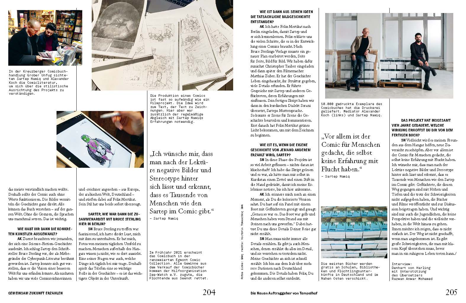 „Das Buch schildert auf 220 Seiten und mit 435 Abbildungen einen höchst ungewöhnlichen Dialog. Internationale Künstlerinnen und Künstler arbeiten mit Menschen zusammen, die bislang nichts mit zeitgenössischer Kunstproduktion zu tun hatten. Sie reagieren auf Hoffnungen und Wünsche, entwickeln neue Visionen und Ideen.
