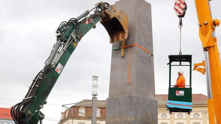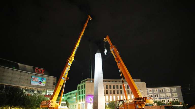 Der Verbleib des Obelisken entwickelte sich zu einem Politikum im Kasseler Rathaus, da eine Mehrheit der Stadtverordneten den vom Künstler geforderten Standort auf dem Königsplatz ablehnte. In weiteren Verhandlungen mit Oguibe zeichnete sich zeitweise eine Einigung ab. Ins Gespräch gebracht wurde die Idee, den Obelisken an einen neuen Standort zu versetzen, etwa vor ein noch zu bauendes Documenta-Institut. Da die Stadt auf ihrem Beschluss beharrte, das Denkmal nicht auf dem Königsplatz zu belassen, der Künstler aber weiter darauf bestand, das Kunstwerk speziell für diesen Platz geschaffen zu haben, entfernte die Stadt Kassel das Mahnmal am frühen Morgen des 3. Oktober 2018 nach Ablauf der vertraglichen Leihfrist in einer unangekündigten Aktion ohne Wissen der Kulturdezernentin vom Königsplatz und lagerte es auf einem Bauhof ein. Die vom Kasseler Oberbürgermeister Christian Geselle (SPD) verantwortete Aktion, für die er teils scharf kritisiert, teils überschwänglich gelobt wurde, wurde von Anhängern beider Seiten vielfach als Erfolg der AfD gewertet.