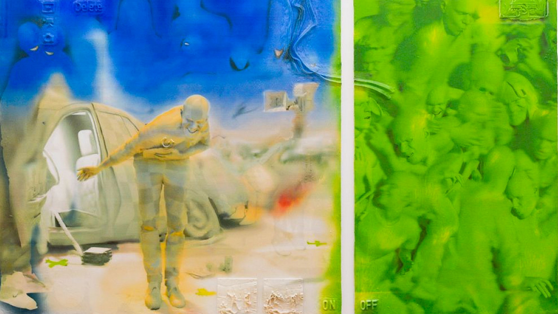 Oder auch nicht. Der rechte Teil des Diptychons ist ein Wimmelbild, in giftgrüner Farbe gehalten, der Farbe der digitalen Green-Screen-Technik. Es ist ein hektisches Gemenge der immergleichen glatzköpfigen Figur, die wir im linken Bild bereits sahen, und die wieder und wieder in unterschiedlichen Posen und Grimassen erscheint, krampfig, gewunden und verzerrt. Es ist wie ein Blick auf den Müllhaufen abgelegter Rollenhülsen. Oder blicken wir in den Spamordner für verbrauchte Selbstbilder, in dem das eigene Leiden und der eigene Wahn – die eigenen Ich-Unfälle – in der Hölle des Unbrauchbaren schmoren?