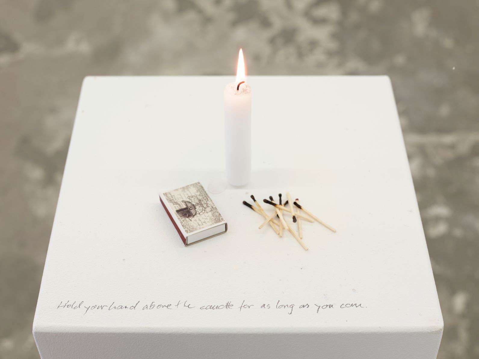 In einer einfachen Versuchsanordnung testen Clegg & Guttman (IL/US) die Bereitschaft des Publikums, Schmerz zu empfinden. Eine Kerze und ein Feuerzeug werden zur Verfügung gestellt, und die Anweisung lautet, die Hand so lange über die brennende Kerze zu halten, wie sich aushalten lässt. Die kleine partizipative Plastik entspringt der Videoarbeit Follow the Rule von 2019.