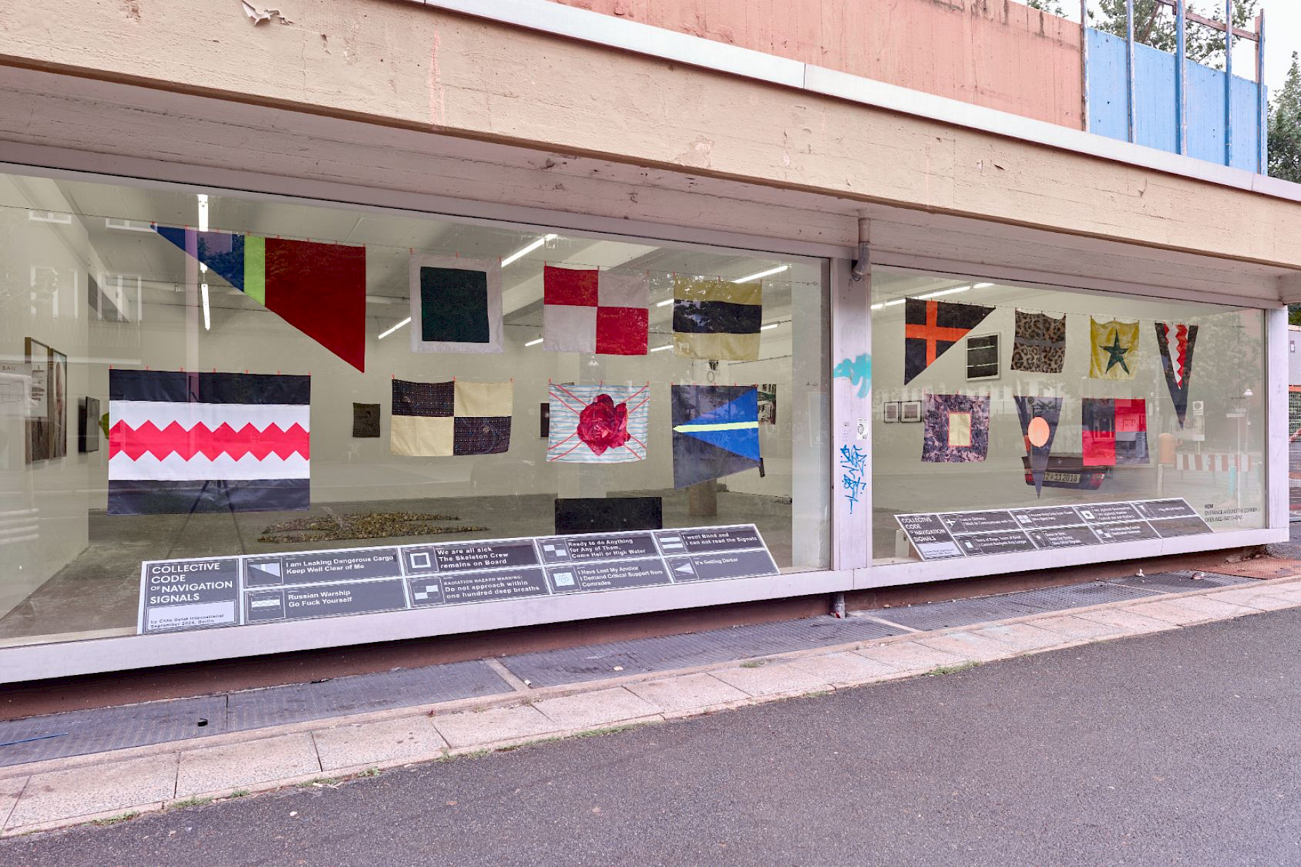 In den Schaufenstern der Galerie zeigen Chto Delat (RU) 16 Signalflaggen, die der Seeschifffahrt entlehnt sind (2024). Die dazugehörige Legende erklärt jedoch keine Seefahrtsregeln – die Flaggen zeigen Gemütszustände an, persönliche Botschaften der Erschöpfung, der Selbstsorge und der Wut. Alle Mitglieder des russischen Kollektivs Chto Delat leben heute im Exil, einige mussten das Land wegen akuter Gefahr abrupt verlassen.