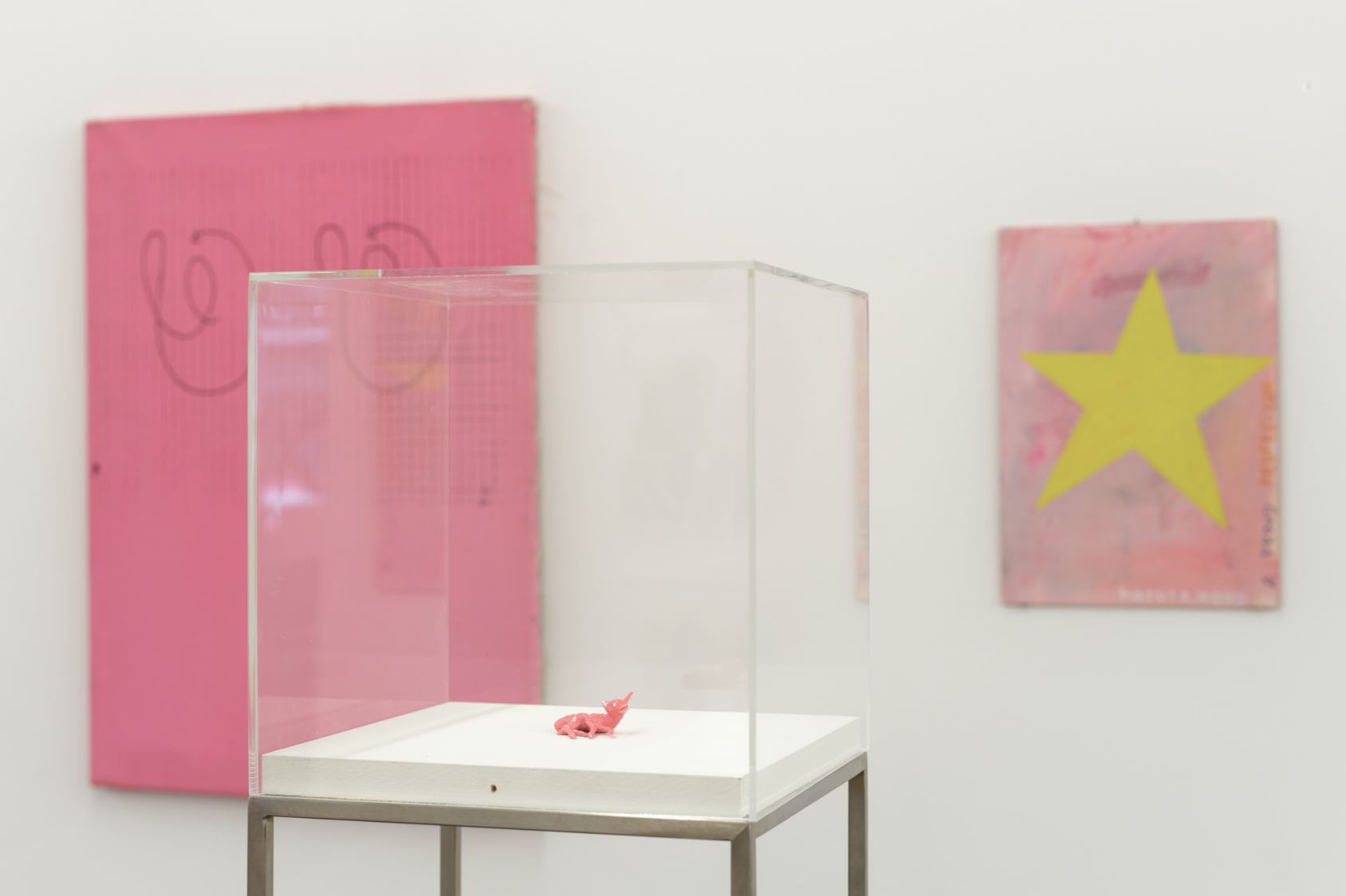 Von Peter Friedl (AT) sind rosafarbene Werke aus den frühen 1990er Jahren zu sehen: ein kleines Reh und zwei Bilder. In Friedls Werk ist jede Bedeutung per se fragil oder prekär, weil offen für das eigene Denken und gut abisoliert gegen Deutungsregime Dritter. Seine Siebdruck-Malerei Ohne Titel (Volontà )von 1990 hat eine anthroposophische Skizze als Quelle, eine choreografische Notation für eurythmische Körperbewegungen, die den Willen stärken sollen.