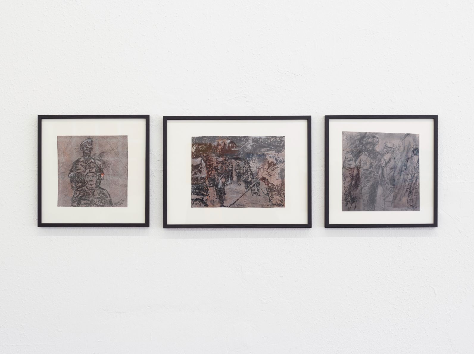 In ihrer fortlaufenden Serie von Kohlezeichnungen (Repository, 2024) verarbeitet Helena Uambembe (ZA) Archivfotos des südafrikanischen 32-Bataillons, dem auch ihr Vater angehörte. Die Fotos zeigen Soldaten im Feld, bei der Parade oder bei offiziellen Anlässen, oft kursieren die Bilder ohne Zusammenhang in sozialen Medien, das Personal wird anonymisiert, eine Nummer im Apparat. Mit dem Stück Kohle holt Uambembe diese Geschichten und Schicksale zurück in die materielle Welt.