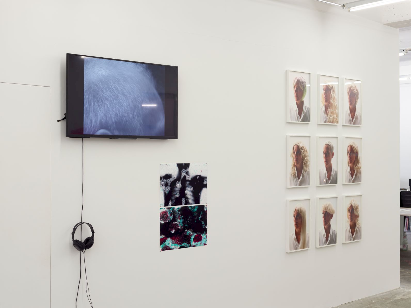 Candice Breitz (ZA/DE) zeigt neun Fotografien aus ihrem Projekt Whiteface (2022), das auf beißend satirische Weise typische Formen der Selbstverteidigung weißer Vorherrschaft ausstellt. Unter verschiedenen blonden Perücken und mit Zombie-Kontaktlinsen schlüpft Breitz in unterschiedliche Rollen weißer Identitätspropaganda.